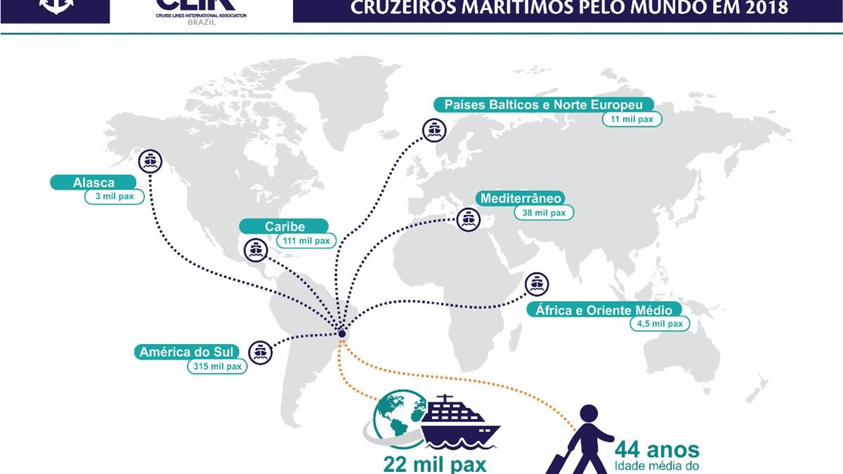 No ano passado, 510 mil brasileiros viajaram em cruzeiros por todo o mundo, 15% a mais do que em 2017, segundo levantamento da Clia Global. Cerca de 315 mil embarques tiveram como destino a costa brasileira e toda a América do Sul, continente que teve 13% vendas a mais que no ano anterior. O público, que em geral prefere viagens de até 7 dias, tem em média 44 anos.