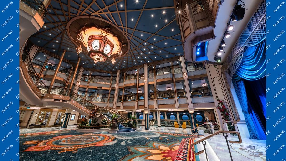 Ao adentrarem o Disney Treasure pela primeira vez, os hóspedes estarão em um verdadeiro palácio. O Grand Hall do navio tem influências da Ásia e da África, com detalhes de Agrabah, terra de Alladin.