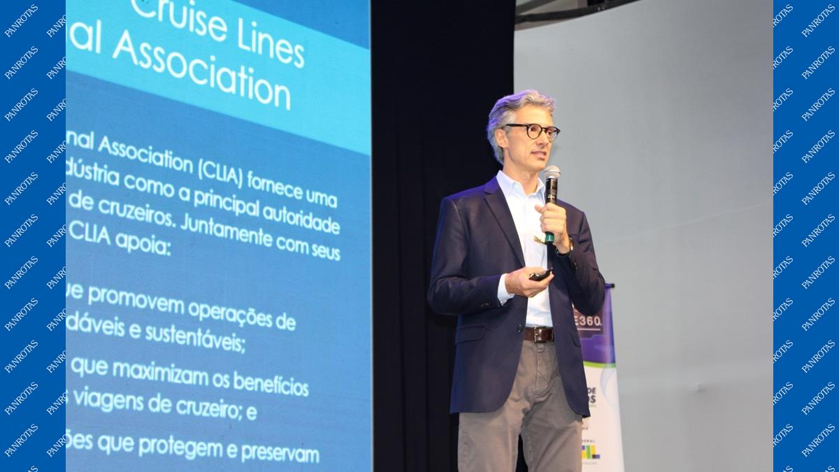 SANTOS (SP) - Marco Ferraz, presidente da Clia Brasil, subiu ao palco desta 2ª edição do Cruise360 no Brasil, que começou na manhã deste sábado (15), para destacar a importância dos agentes de viagens na comercialização de cruzeiros marítimos.