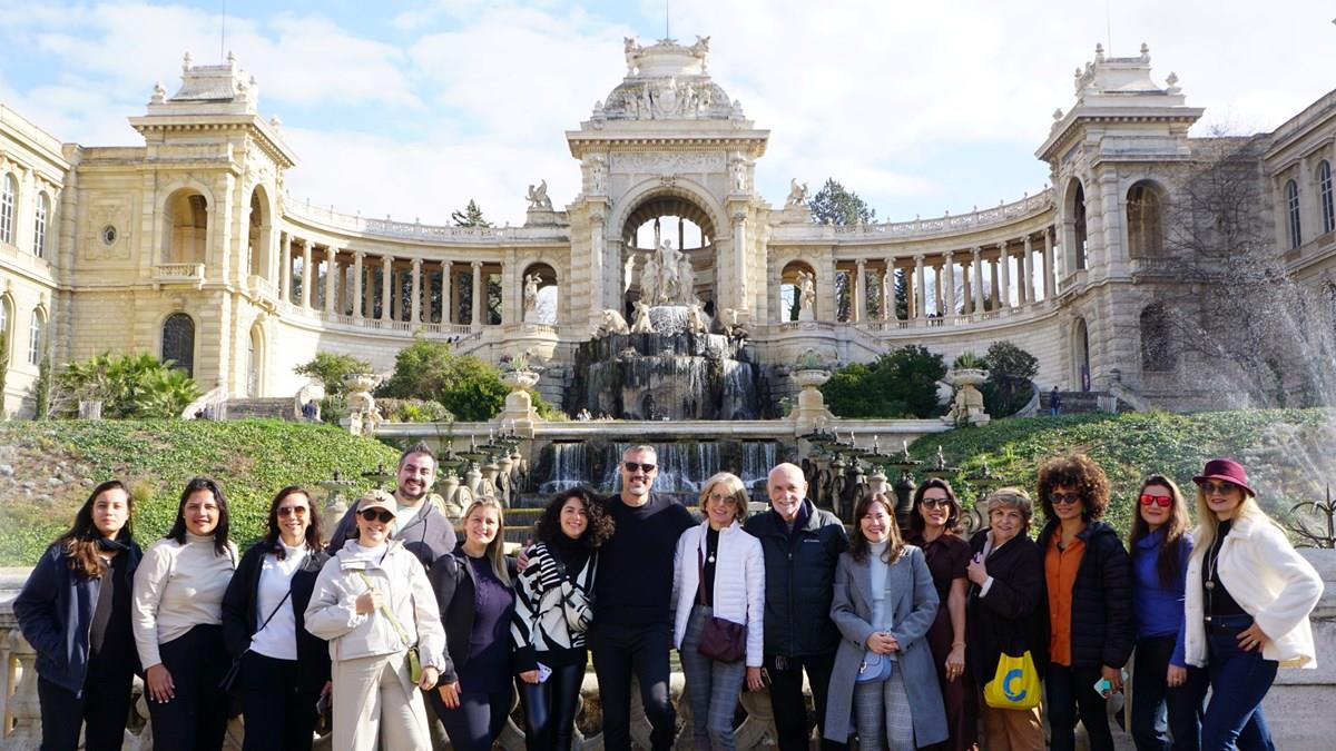 A excursão “Todo o Marselha: entre vistas e cantos autênticos” percorreu alguns dos principais pontos da cidade. O roteiro incluiu trajeto pela Corniche Kennedy, via litorânea que margeia o Mediterrâneo. O grupo também fez parada para fotos no Palais Longchamp, monumento histórico inaugurado no século 19, e caminhou pelo centro da cidade.