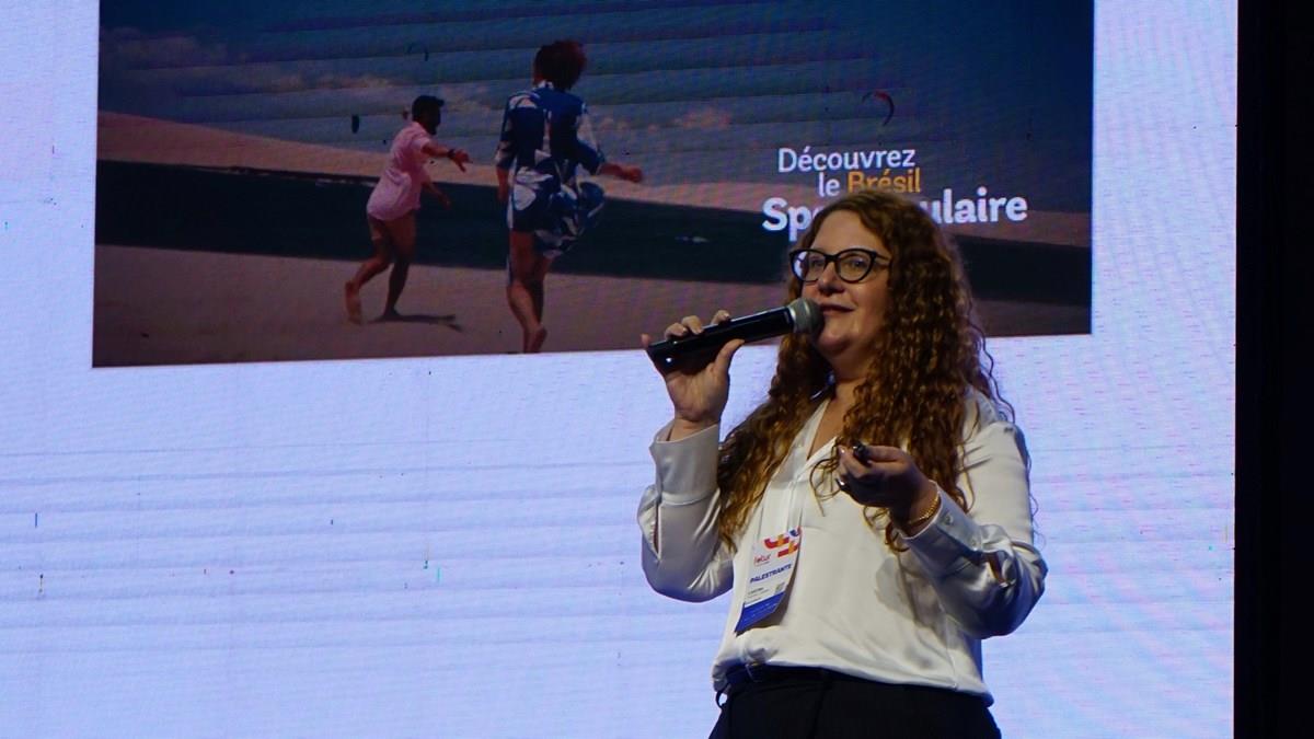 Carina apresentou o Portal de Dados da Embratur, que reúne estudos gratuitos sobre destinos, mercados prioritários e treinamentos. Segundo ela, o trabalho é guiado por inteligência de mercado: “Tudo que a gente faz hoje é baseado em dados.”