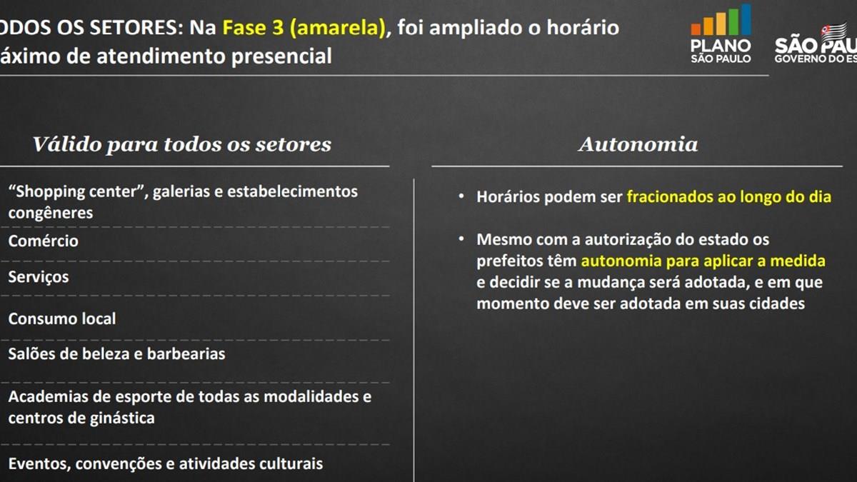 O governo do Estado também atualizou o horário limite de atendimento presencial da fase verde (4) do Plano SP, apesar de nenhuma região ter chegado a esse estágio. A nova medida permite que os estabelecimentos atendam clientes até as 22 horas seguindo as medidas vigentes, como a capacidade limitada a 60% dos assentos, a limitação das operações a ambientes ao ar livre ou arejados, a obrigatoriedade de assentos e o uso obrigatório de máscara.