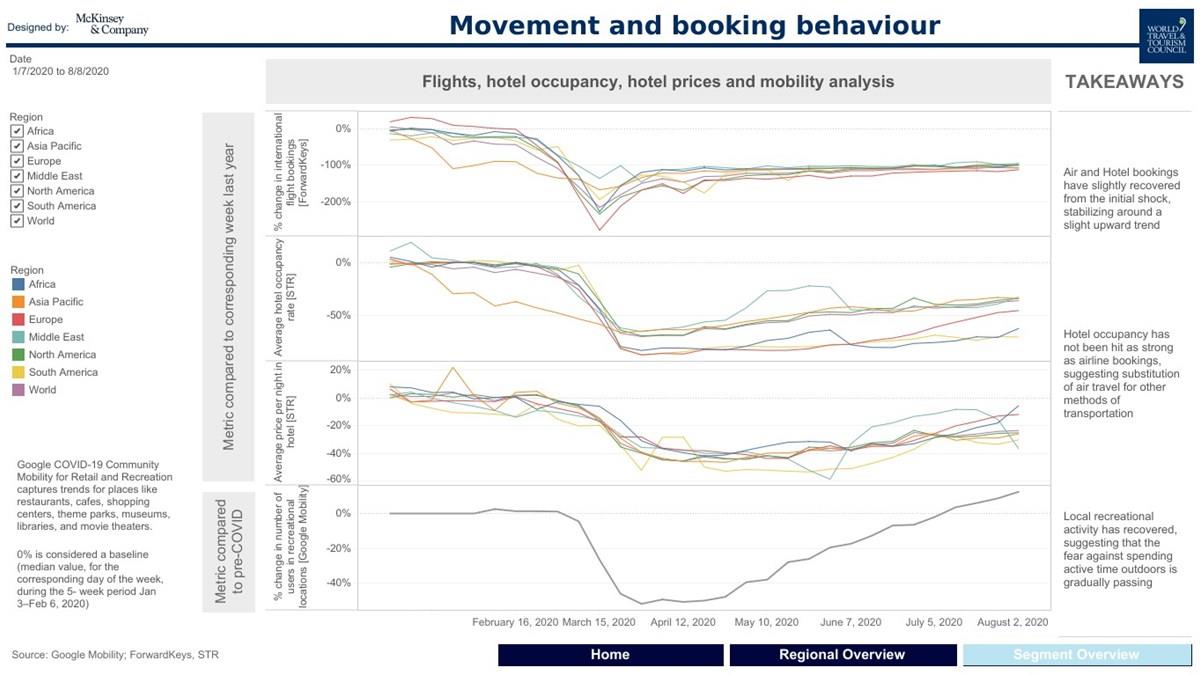 Por meio do dashboard, é possível navegar de maneira útil por uma vasta gama de dados conforme a demanda de deslocamentos ao redor do mundo muda, em resposta à reabertura gradual das fronteiras, conforme as restrições de viagens são suspensas.