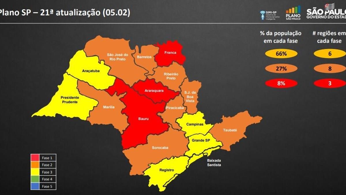 Na última quarta-feira (3), o governador João Doria havia suspendido o decreto que colocava todo o estado na Fase Vermelha. Segundo a previsão inicial do Governo de SP, do dia 25 de janeiro, o estado permaneceria na fase mais restritiva até 7 de fevereiro.