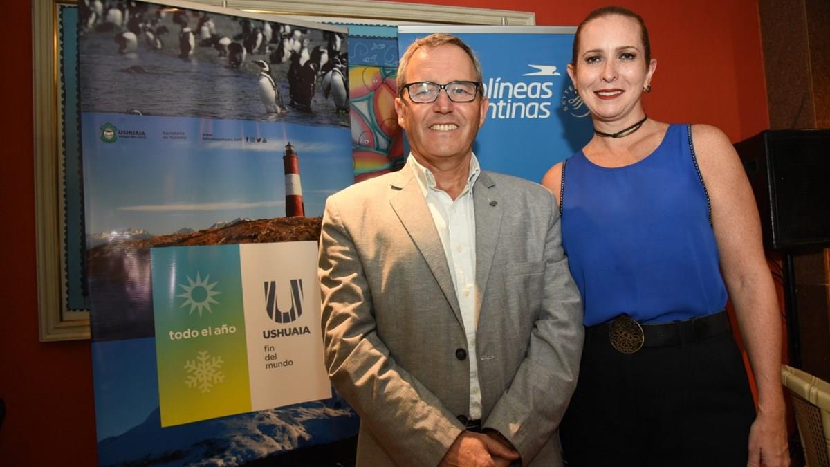 Secretario de turismo de Ushuaia, José Luis Recchia, com a chefe do programa de assuntos internacionais de Ushuaia, Cristiane Cavalli