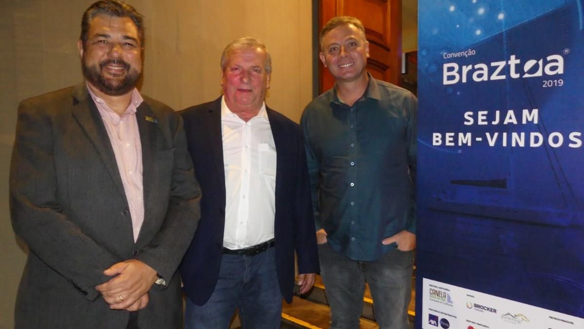 Roberto Nedelciu (presidente da Braztoa) com Constantino Orsolin (prefeito de Canela) e Angelo Thurles (secretário de Turismo de Canela)