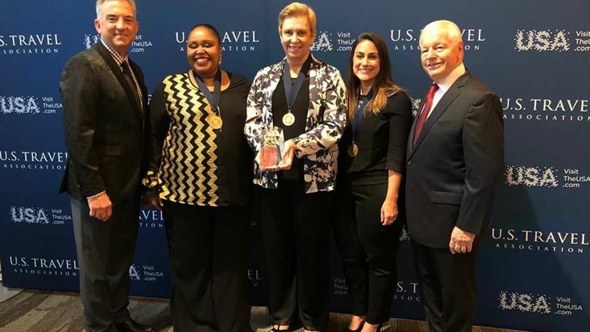Georgia Mariano, Barbara Picolo e Luiza Leopoldo, da Flytour MMT, recebem a premiação por Flytour Viagens e MMTGapnet, que eram duas empresas separadas no ano passado, de Chris Thompson, da Brand USA, e Roger Dow, da US Travel