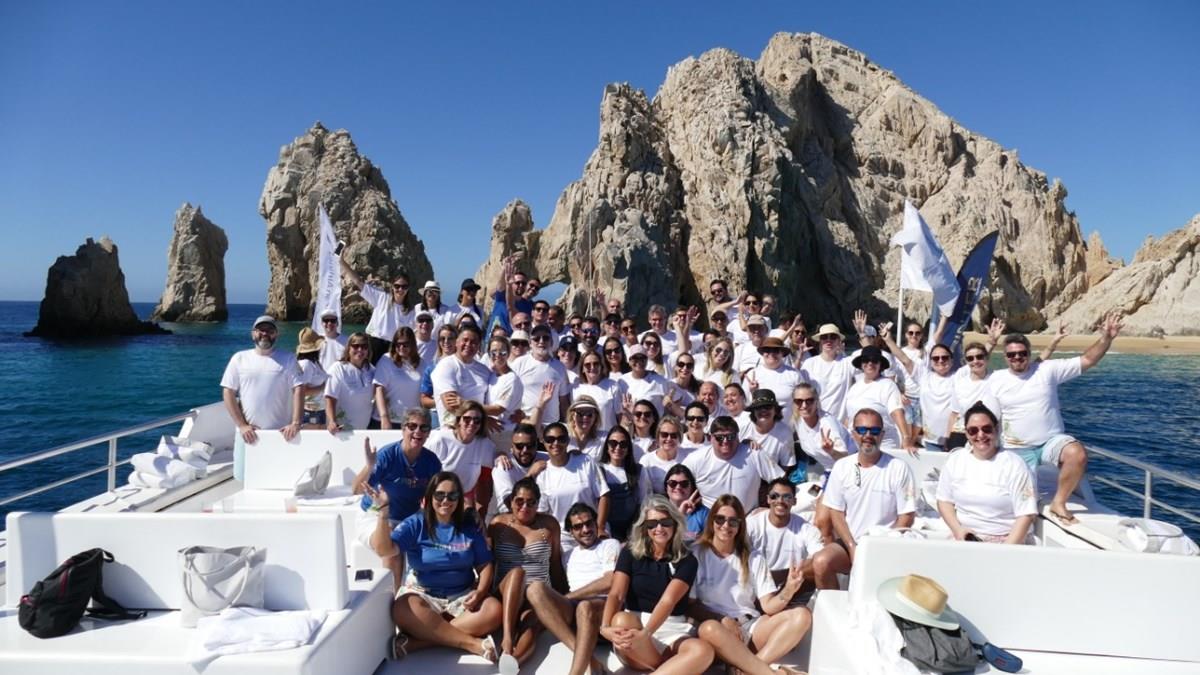 O passeio começou logo cedo, por volta das 9h, na recepção do Le Blanc, o hotel que hospeda todos os 95 convidados (entre agentes, staff e parceiros) da operadora. Todos foram de ônibus até a principal marina da região, localizada em Cabo de San Lucas. Na marina, embarcaram em um barco de dois andares e seguiram rumo aos Arco do Cabo de San Lucas. Toda a logística terrestre está sendo feita pela Corporate Travel Alliance, de Sandra Castañeda, receptivo parceiro da empresa em Los Cabos.