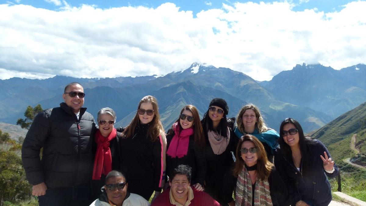 André Lopes, da Diversa, Gilmara, da AD, Priscila Ifange, da Vereda, Marcia de Andrade, da Triunfo, Muriel Lourenço, da ChanceTour, Tarcia Xavier, da Estação Floresta, Gabriela, gerente da Condor em Cusco e, abaixo, Marcos Vinicius, da Abordo, Frank Aragon, e Sandra Cavalheiro, da Foco. O grupo vê a cidade de Valle Sagrado de cima, pelo Mirante de Raqchi, com parte da Cordilheira dos Andes ao fundo