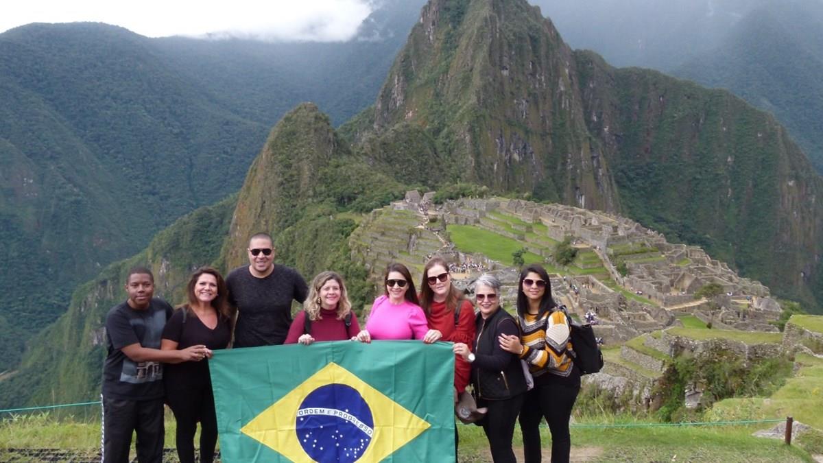 Marcos Vinicius, da Abordo, Sandra Cavalheiro, da Foco, André Lopes, da Diversa, Tarcia Xavier, da Estação Floresta, Marcia de Andrade, da Triunfo, Priscila Ifanger, da Vereda, Gilmara Garcia, da AD, e Muriel Lourenço, da ChanceTour, em Machu Picchu, com a bandeira do Brasil e a imponente Huayna Picchu, com 3.082 metros acima do nível do mar, ao fundo