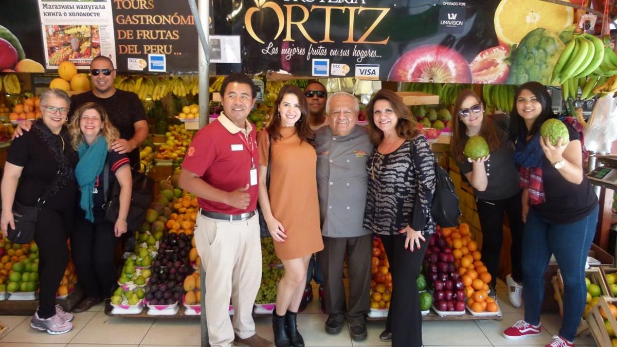 Gilmara Garcia, da AD Turismo, Tarcia Xavier, da Estação Floresta, André Lopes, da Diversa Turismo, Juan Rivas, guia da Condor Travel, Marcia de Andrade, da Triunfo Viagens, Marcos Vinicius, da Abordo Viagens, o fruteiro Sr. Ortiz, Sandra Cavalheiro, da Foco, Priscila Ifanger, da Vereda Turismo, e Muriel Lourenço, da ChanceTour. O grupo visitou o Mercado Municipal de San Isidro, bairro residencial de Lima