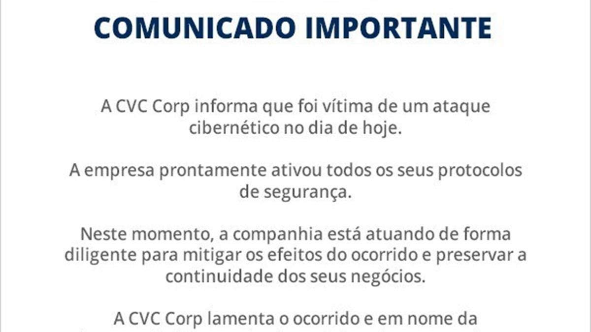 “A CVC Corp informa que foi vítima de um ataque cibernético no dia de hoje. A empresa prontamente ativou todos os seus protocolos de segurança. Neste momento a companhia está atuando de forma diligente para mitigar os efeitos do ocorrido e preservar a continuidade dos seus negócios.