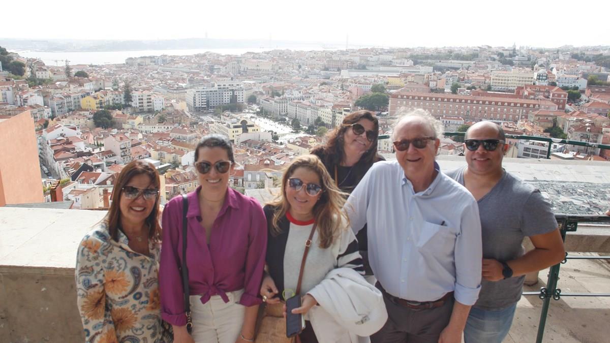 Grupo posa para foto no Miradouro de Nossa Senhora do Monte, um dos pontos mais altos de Lisboa