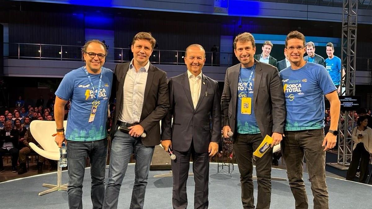 Fábio Godinho, CEO da CVC Corp, Fabrício José Satiro de Oliveira, prefeito de Balneário Camboriú, Jorginho Mello, governador de Santa Catarina, Bruno Heleno, diretor de Sourcing Nacional da CVC Corp, e Túlio Oliveira diretor executivo B2C, de Novos Negócios e Planejamento Estratégico da empresa