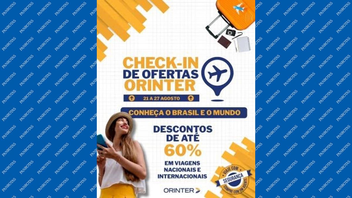 A Orinter iniciou ontem (21) a sua nova campanha de vendas, “Check-in de Ofertas Orinter”, que segue até o dia 27 de agosto. Durante sete dias, as mais de sete mil agências de viagens parceiras da operadora terão acesso a condições especiais e descontos de até 60% em produtos nacionais e internacionais.