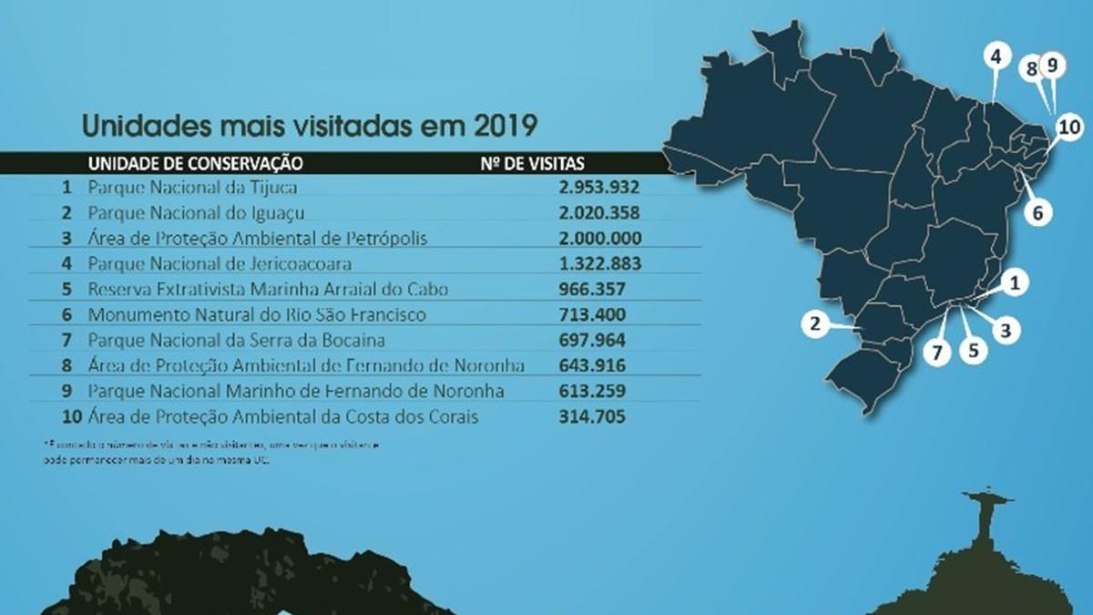 Quem lidera o ranking é o Parque Nacional da Tijuca, no Rio de Janeiro, com quase três milhões de visitantes no ano passado, seguido do Parque Nacional do Iguaçu, no Paraná, com mais de dois milhões. A Mata Atlântica foi a escolha da maior parte dos turistas, presente em quatro das dez unidades mais visitadas, o que representa 67% da visitação total.