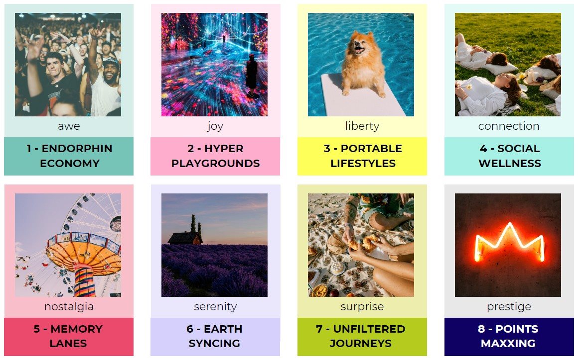 - Hyper playgrounds: a fuga da rotina hiperprodutiva impulsiona a procura por experiências lúdicas e imersivas. Mais de 30% dos viajantes buscam hotéis com design arrojado e divertido, enquanto 43% se sentem atraídos por restaurantes conceituais e performáticos.