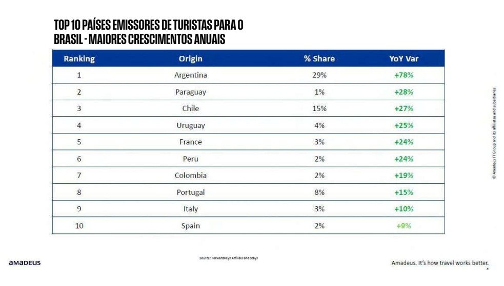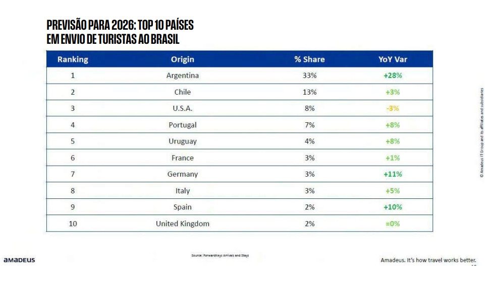 Alemanha, Espanha e Portugal também devem apresentar crescimento projetado relevante, enquanto os Estados Unidos aparecem com leve retração prevista de 3%, possivelmente reflexo de ajustes na oferta aérea, na política e no ambiente econômico global, além da exigência de vistos para americanos, reeditada pelo governo brasileiro.