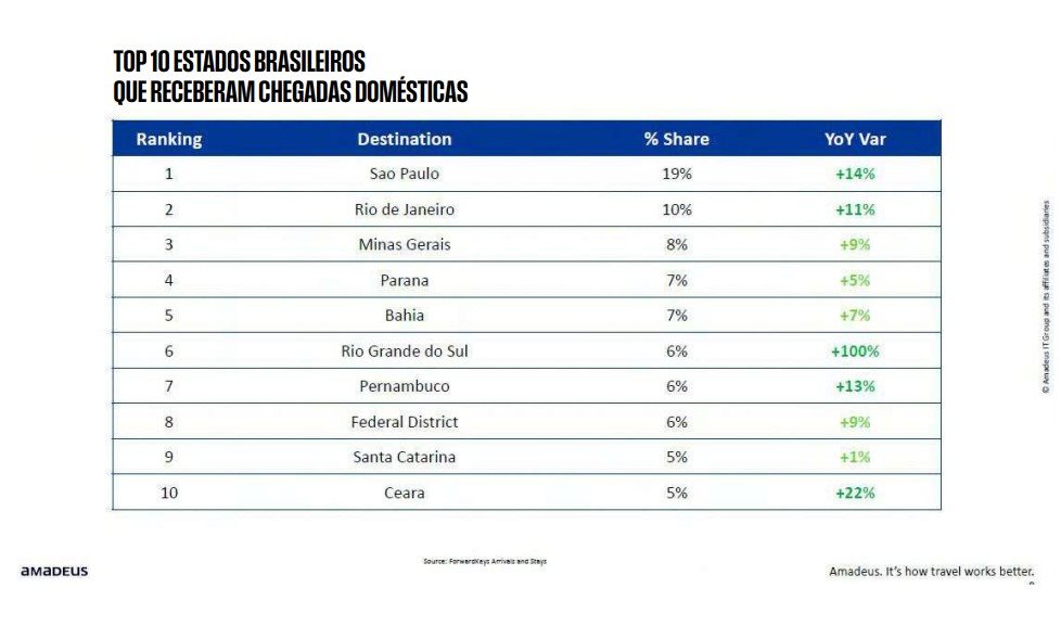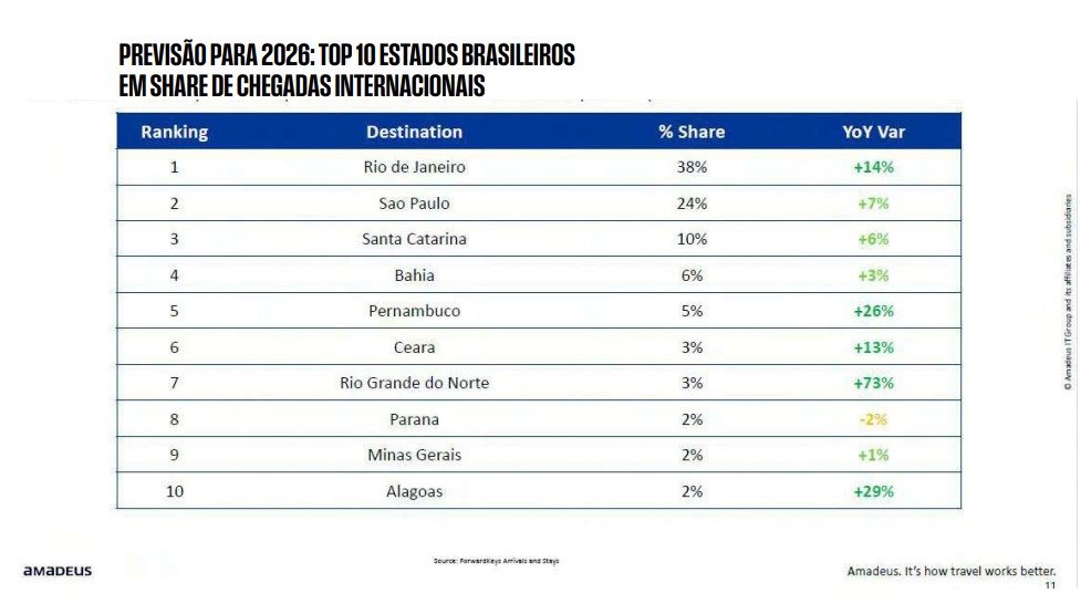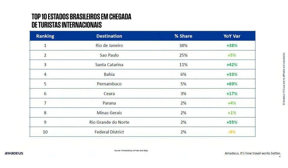 A Amadeus também divulgou o ranking dos Estados que mais recebem visitantes internacionais, com o Rio de Janeiro na liderança absoluta, concentrando 38% das chegadas e crescendo expressivos 38% sobre o ano anterior. O dado mostra uma recuperação robusta do destino, impulsionada por eventos, retomada da conectividade aérea e reforço da imagem internacional da cidade.