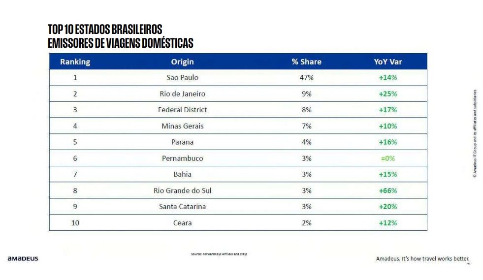 O dado mais surpreendente surge no Rio Grande do Sul, que cresce 66% como emissor doméstico, indicando recuperação e maior mobilidade da população local , depois de um período marcado por isolamento causado por enchentes e fortes chuvas. Santa Catarina também cresce acima da média, com alta de 20%, enquanto Estados do Nordeste mantêm expansão consistente. Pernambuco é o único que mantém estabilidade, sem variação significativa.