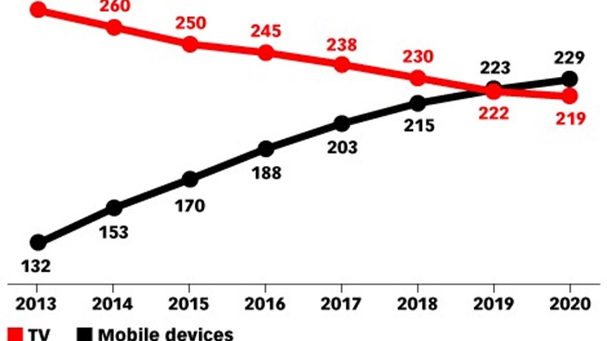 De acordo com o último estudo do Emarketer, os adultos gastam, em média, três horas e 50 minutos por dia à frente da televisão, mais tempo do a qualquer outro meio. No entanto, comparado ao tempo que era gasto em 2012 – quatro horas e 37 minutos –, pode-se notar uma queda de 16,9% do tempo gasto.