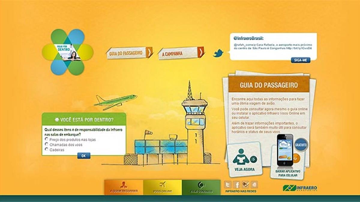 A ferramenta, que informa a situação dos voos por aeroporto e por companhia aérea, traz ainda uma versão eletrônica do Guia do Passageiro, faz parte da campanha Fique por Dentro. O objetivo é informar ao usuário sobre seus direitos e deveres, além de apresentar o papel da Infraero e de outros integrantes do setor aéreo, como Anac, companhias aéreas, Departamento de Controle do Espaço Aéreo e órgãos públicos que atuam nos aeroportos – Polícia Federal, Receita Federal e Vigilâncias Sanitária e Agropecuária.