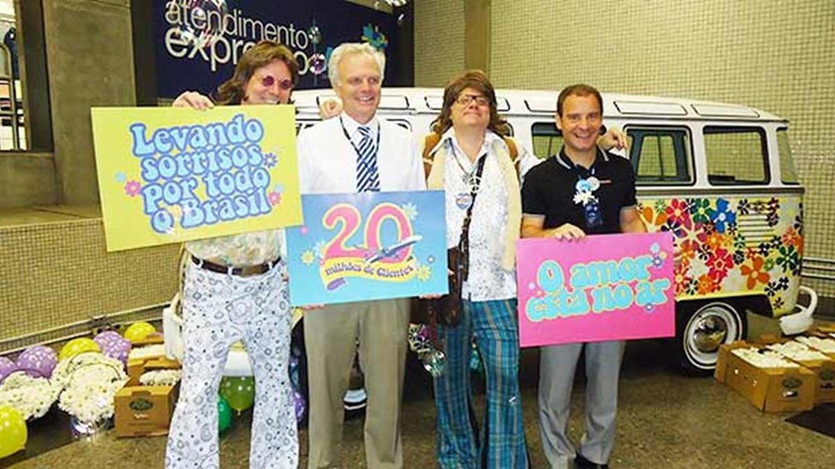O diretor de Comunicação e Marca da companhia, Gianfranco Beting, capitaneava os funcionários da Azul que distribuíam flores pelo terminal. Todos com visual hippie e o tema “O Amor está no Ar”, que surpreendeu até Neeleman. “É o amor no sentido de retribuir todo o carinho dos passageiros pela companhia que atinge 20 milhões de passageiros em tempo recorde”, explicou Caprioli.