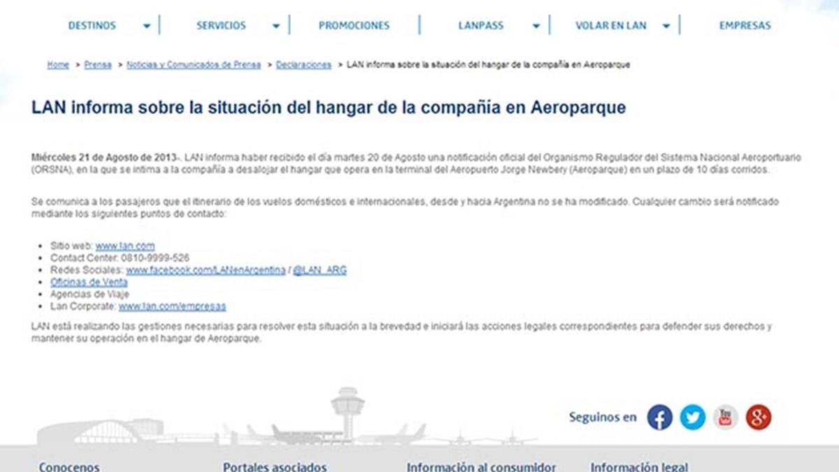 Na semana passada, o governo deu prazo de dez dias para a desocupação do hangar, sendo que a companhia anunciou que a falta dele impediria a manutenção dos voos a partir do Aeroparque. A companhia aérea já entrou na Justiça para suspender a determinação do governo argentino. Na manhã de hoje, o diretor de Assuntos Corporativos da Lan Argentina, Agustín Agraz, criticou alguns programas da TV pública Argentina 678, que teria classificado a Lan Argentina como “companhia aérea de bandeira da oposição”. O executivo destacou que três mil pessoas trabalham na empresa aérea, “todas argentinas”.