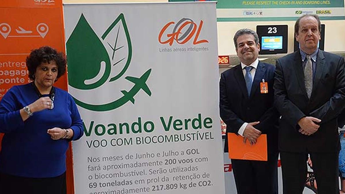 A Gol lançou hoje no Aeroporto Santos Dumont, no Rio de Janeiro, seu primeiro voo comercial com bioquerosene. O objetivo do uso do biocombustível é reduzir a emissão de gases de efeito estufa para grandes eventos esportivos. O voo inaugural seguiu às 11h para Brasília levando dentro do Boeing a ministra do Meio Ambiente, Izabella Teixeira.