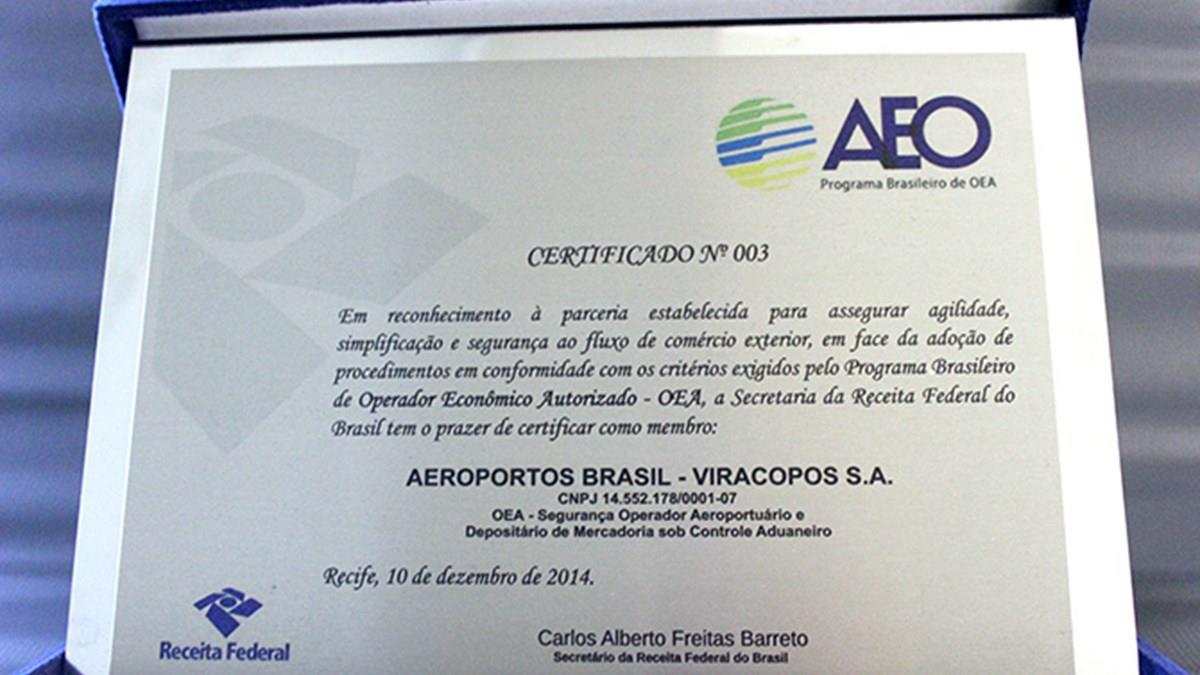 Primeiro aeroporto do Brasil a receber a certificação de Operador Econômico Autorizado (OEA), o Aeroporto de Viracopos está na lista de cinco empresas brasileiras que também receberam a certificação: Embraer, DHL Global Forwarding, 3M do Brasil, Aeroportos Brasil Viracopos S/A e CNH Industrial.