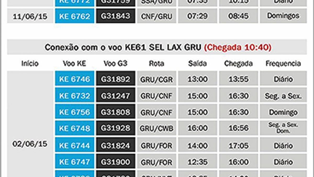 Desde o começo da mês a Korean Air e a Gol estão operando voos em code-share a partir do Aeroporto de Guarulhos, em São Paulo. São 15 voos da Gol que se conectam com os voos da Korean de e para Los Angeles, nos Estados Unidos.