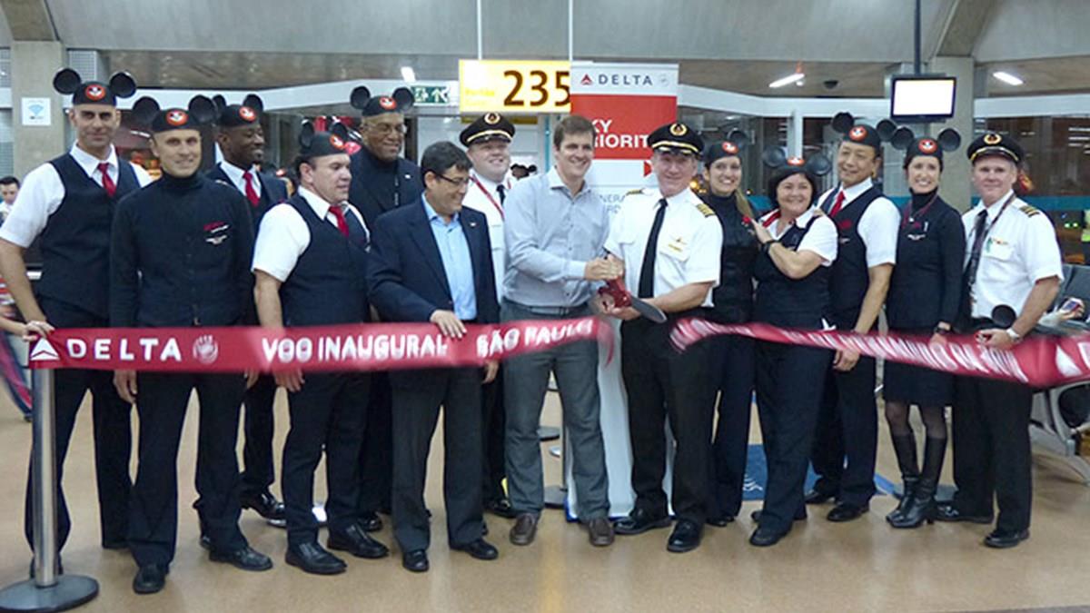 A Delta utilizou o saguão do aeroporto de Guarulhos, em São Paulo, para iniciar as comemorações de sua nova rota: São Paulo-Orlando.