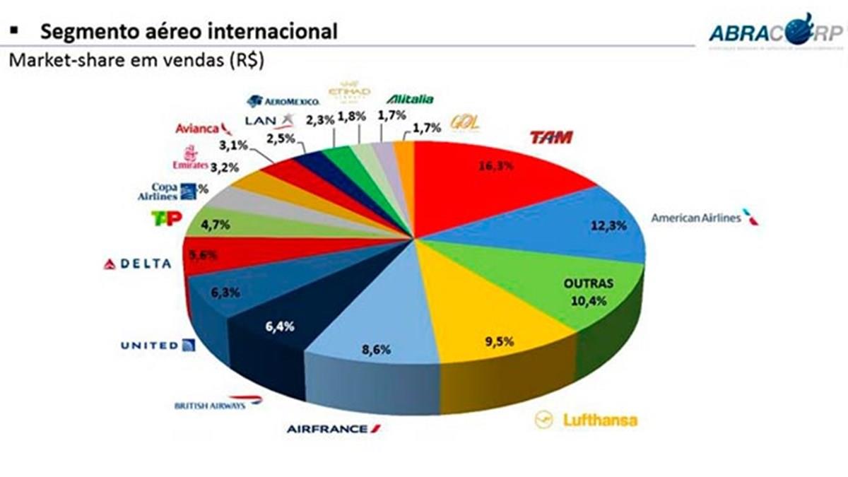 A Tam liderou, em 2015, o market-share de vendas no segmento aéreo internacional da Abracorp. A aérea representa 16,3% das vendas. A American é a segunda, com 12,3% das vendas. A soma de “outras companhias” representa 10,4%. A principal companhia europeia no ranking é a Lufthansa, a quarta no to