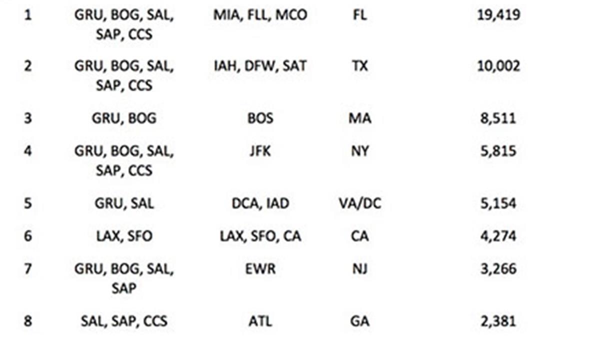 Ainda de acordo com o estudo, o Aeroporto Internacional de Boston, o John F. Kennedy International (Nova York), e os aeroportos Ronald Reagan e Dulles (Washington), todos nos Estados Unidos, são os próximos da lista que mais receberão passageiros provenientes de localidades com o vírus.