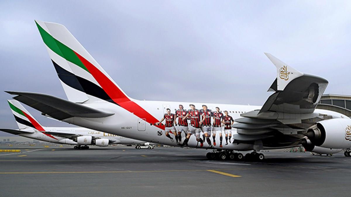 Craques da equipe italiana Milan como Mario Balotelli, Carlos Bacca, Keisuke Honda e outros estão estampados no A380 da Emirates que faz a rota Dubai-Milão-Nova York. Batizada de “AC Milan A380”, a aeronave já está operando. A Emirates é patrocinadora de grandes clubes de futebol europeu. Além do Mi