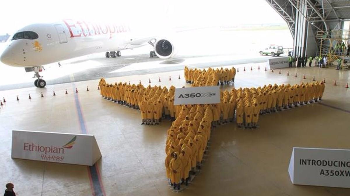 A Ethiopian Airlines recebeu ontem (29), em sua sede em Addis Ababa, capital da Etiópia, o primeiro Airbus 350 XWB a sobrevoar o continente africano. Masa companhia resolveu celebrar o acontecimento de uma forma inusitada: reuniu 350 membros de staff para reproduzir a maior imagem de avi&