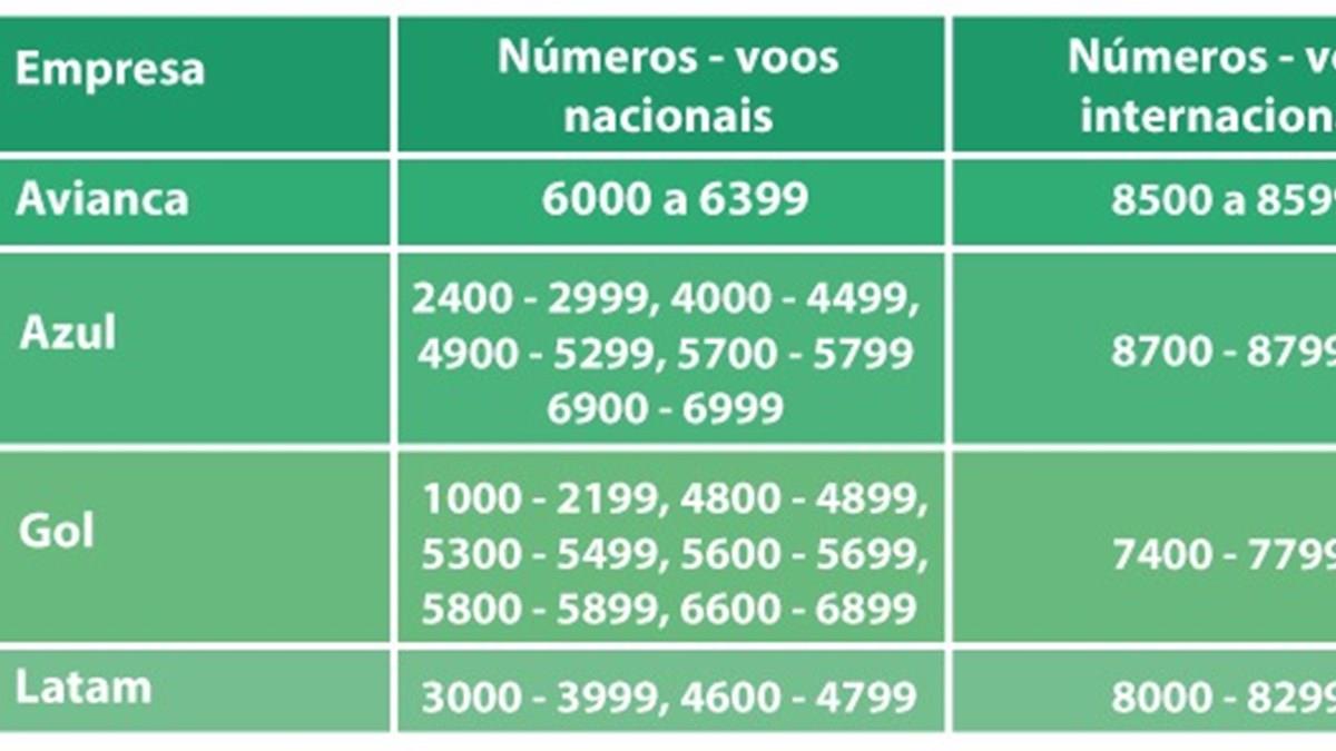 A Anac estabelece que os voos nacionais devam ser escolhidos dentro de uma faixa que vai se 1000 a 6999; os internacionais, de 7000 a 8999. Para facilitar na combinação dos números, cada companhia aérea recebe um intervalo dentro dessa faixa de números para utilizar em suas operações. Veja na tabela abaixo os grupos de números oferecidos às empresas nacionais.
