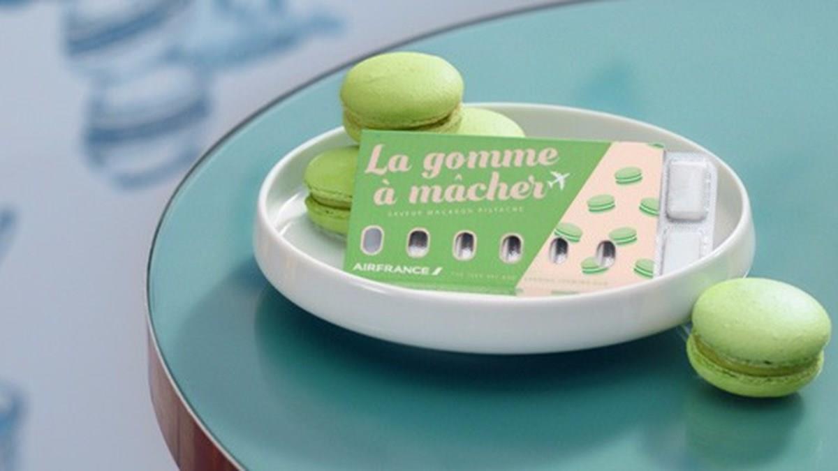 Dois sabores estão disponíveis, ambos ao estilo local: macaroons de pistache e crème brûlée. A goma é feita na França e é 100% natural, segundo a aérea.