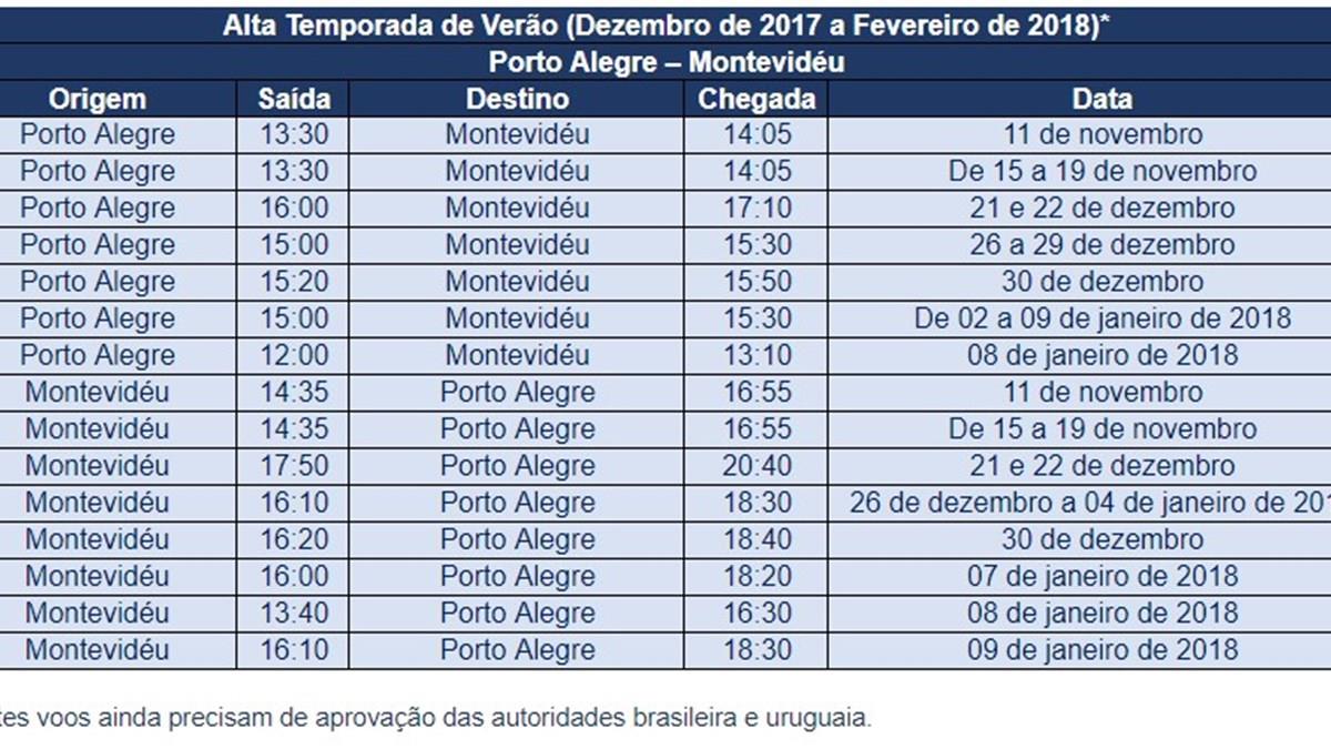 Durante os feriados de Nossa Senhora Aparecida e de Finados, a companhia vai operar cerca de 40 voos extras no trecho Porto Alegre–Montevidéu. E, ao longo da alta temporada de verão, que vai de dezembro deste ano a fevereiro de 2018, a empresa pretende disponibilizar 30 voos entre os destinos (essas operações, no entanto, ainda aguardam aprovação das autoridades do setor aéreo).
