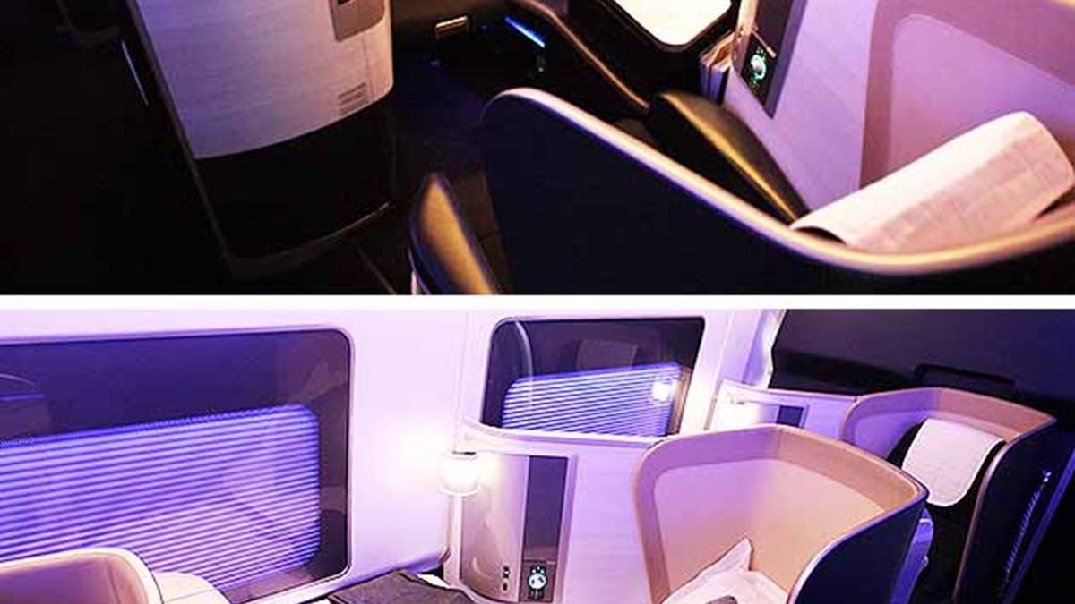 Entre os diferenciais está a opção de escolher o horário mais conveniente para fazer suas refeições, armário próprio para guardar sapatos ou paletós, por exemplo, e ainda iluminação especial, que muda de acordo com o voo.