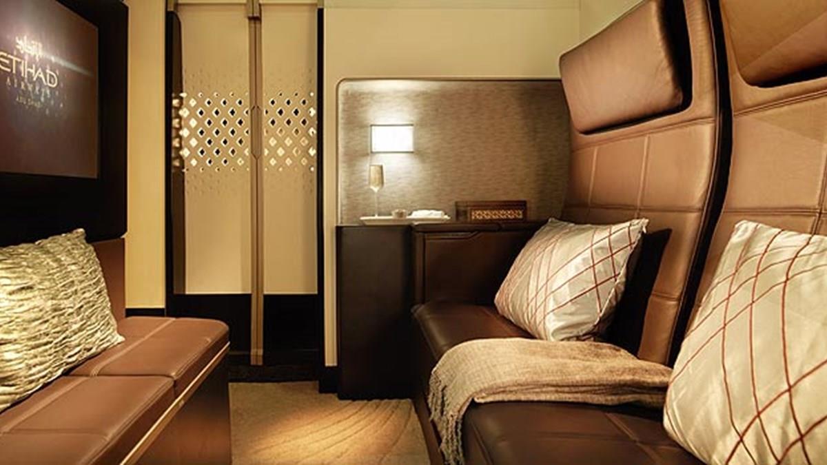 The Residence by Etihad, exclusiva do A-380 e com três ambientes: sala, banheiro e quarto com cama de casal. Pode acomodar até duas pessoas, algo inédito na aviação.
