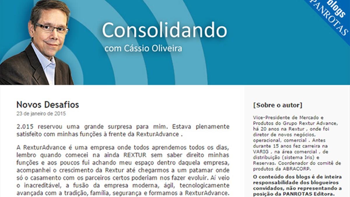 Cássio Oliveira se desliga da Rextur Advance nos próximos dias para assumir a diretoria executiva da Associação Brasileira dos Distribuidores de Passagens Aéreas e Serviços de Viagens (AirTkt). Em seu mais recent post no blog que assina aqui no Portal PANROTAS, o Consolidando, o executivo fala um pouco da sua trajetória profissional na empresa que deixará após mais de 20 anos de trabalho e agradece alguns parceiros de jornada, entre eles, os agentes de viagens. Leia o post completo clicando aqui.