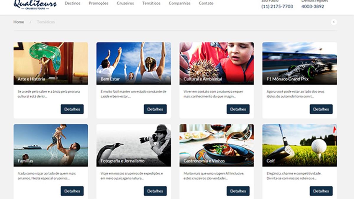 A Qualitours Cruises & Tours anunciou a criação de um portal de cruzeiros temáticos. Por meio da página (www.cruzeirosmaritimos.com.br/lista-de-tematicos) e com o agrupamento de assuntos em uma mesma janela, como arte e história, fotografia e jornalismo, cultura e ambiental, a ferramenta permita a reserva on-line, com atendimento prioritário.