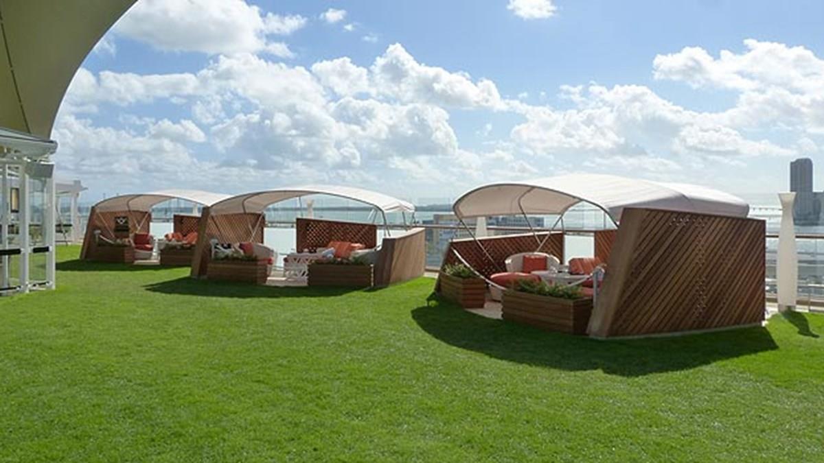 No Lawn Club, uma área gramada ao ar livre, perto das piscinas, cabanas luxuosas podem ser reservadas, com direito a serviço exclusivo e um telefone para se comunicar com o restaurante Lawn Grill e outros serviços do navio. Mesmo em um ambiente aberto e público, as cabanas oferecem exclusividade e glamour.
