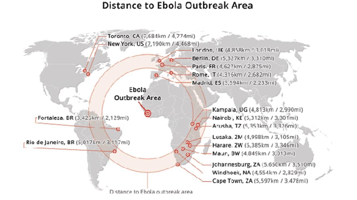 A Braztoa enviou comunicado da Organização Mundial da Saúde (OMS) destacando as distâncias de alguns destinos em relação ao epicentro da epidemia do vírus Ebola, em países como Serra
