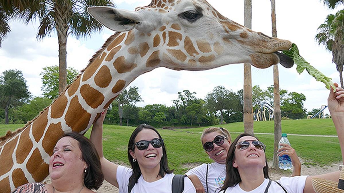 Na sequência, o grupo de profissionais latino-americanos seguiu para o Busch Gardens Tampa Bay, onde começou com um safári com direito a interação com girafas (alimentando-as com alface e fazendo carinho no pescoço delas). O tour é pago à parte de custa de US$ 20 a US$ 40, dependendo a estação do ano. A mais nova atração do Busch Gardens é a Falcon´s Fury, uma queda vertical invertida - lá do alto veem-se os prédio de Tampa e as montanhas-russas do parque ficam pequenas.