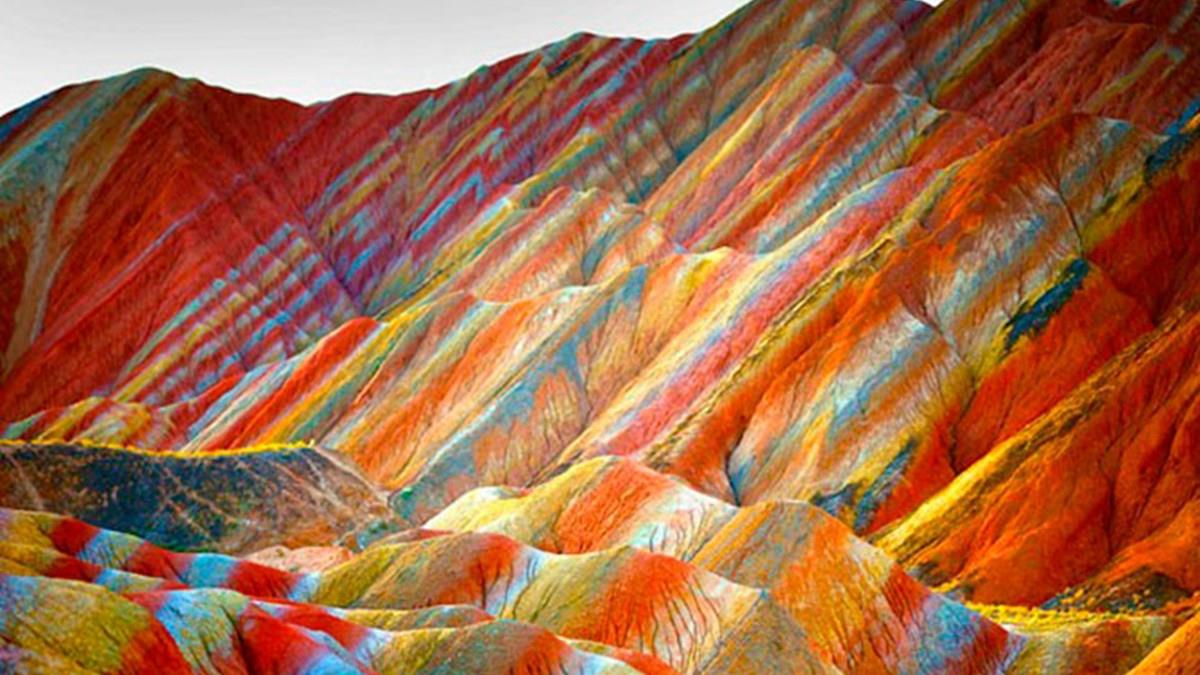 As montanhas parecem ter sido pintadas à mão, mas na verdade são o resultado de anos de ação geológica que aconteceram no local. Este tipo de geomorfologia é única e encontrada apenas na China. Multicoloridas, as montanhas estão localizadas no Parque Geológico Zhangye Danxia.