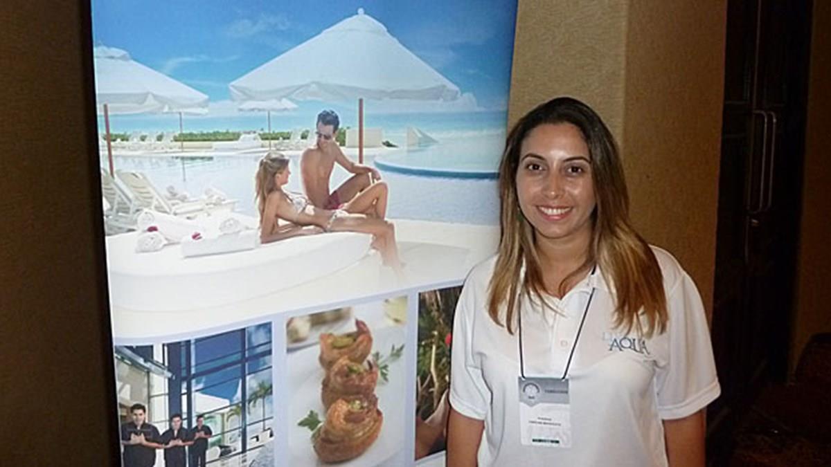 Na sala da Hotelera Posadas, no Nastur 2014, Carol Massocato divulga uma “promoção exclusiva” para a Nascimento Turismo e promove os pacotes de lua-de-mel nos resorts da rede no México