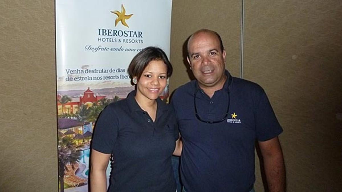 Na sala da Iberostar Hotels & Resorts no Nastur 2014, Marielys de los Santos e Raul Monteiro promovem o Complexo Iberostar na Bahia, com os resorts Iberostar Bahia e Iberostar Praia do Forte, e o barco-hotel da rede que navega pelo rio Negro, no Amazonas