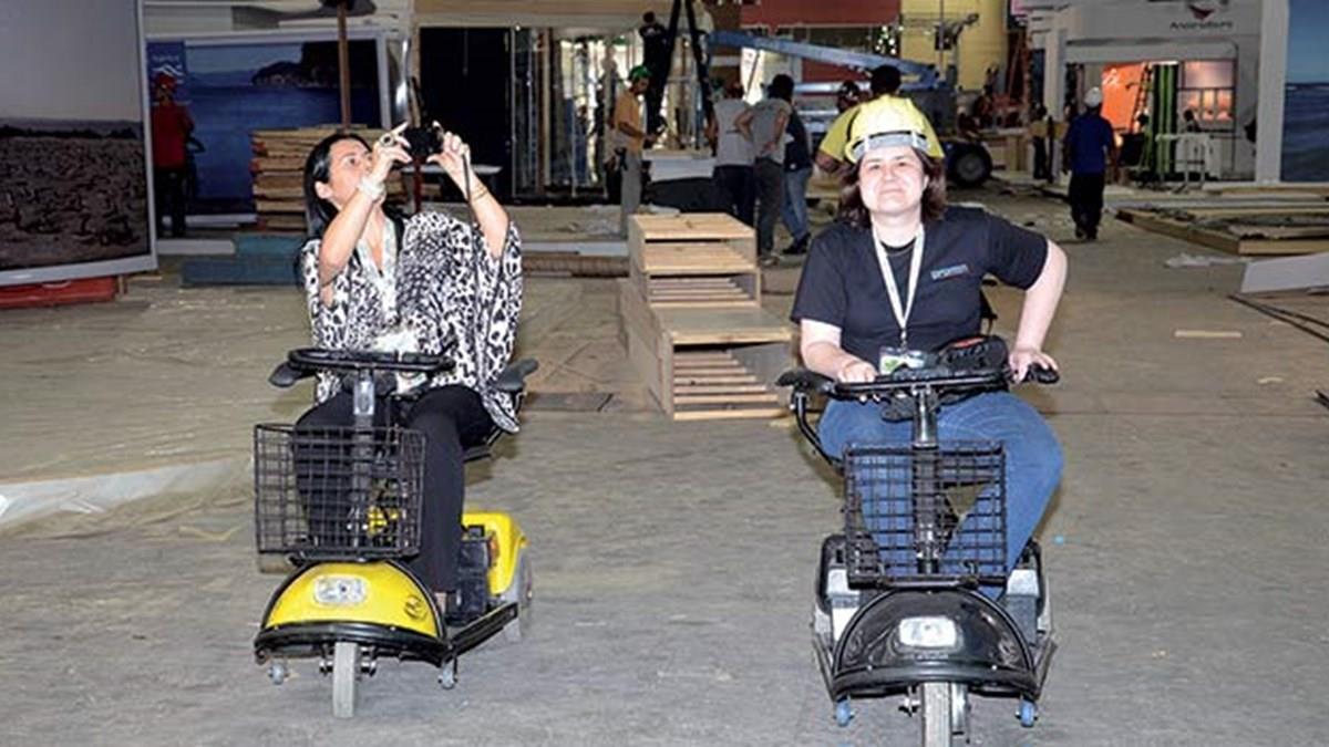 A empolgação da diretora contrasta com a morosidade da fila para retirada das credencias. Por precaução, boa parte dos expositores preferem conferir cada um dos crachás. Isso, somado a certas conferências relacionadas ao pagamento de todas as taxas necessárias, deixa o processo um pouco lento. A dica é chegar o quanto antes para evitar transtornos. Vale lembrar que todos que precisam estar na feira durante o período de montagem precisam usar capacete.